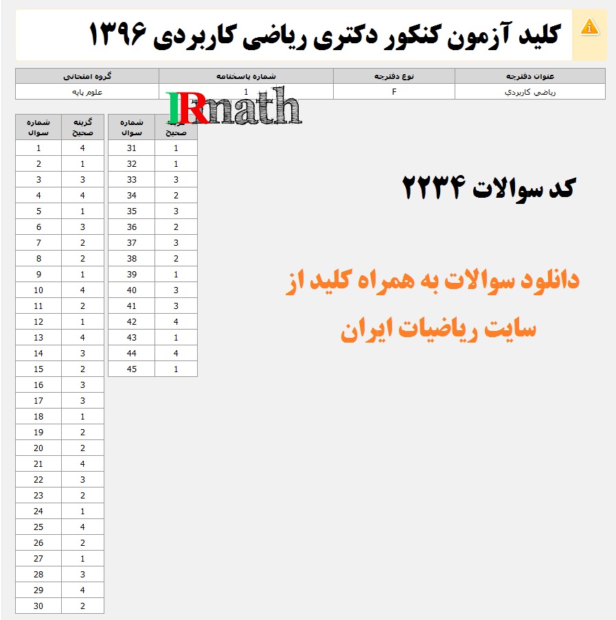 دفترچه کنکور سراسری دکتری ریاضی سال 1396 (دفترچه عمومی، ریاضی محض، ریاضی کاربردی) با کلید سوالات