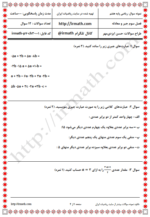 نمونه سوال ریاضی پایه هفتم فصل سوم جبر و معادله- فایل word شماره ۱