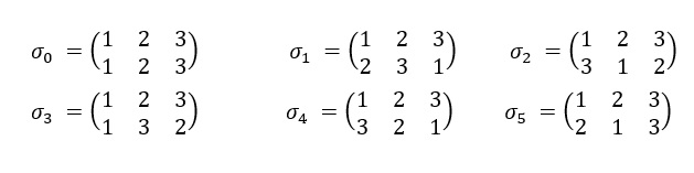 پس در نتیجه مجموعه $S_3$ با عناصری به صورت بالا به دست خواهد آمد که در آن $\sigma_0$ همان عضو همانی مجموعه مذکور میباشد.