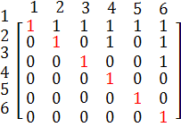 R انعكاسي است اگر و تنها اگر درايه هاي روي قطر اصلي ِ ( قطري كه از بالا سمت چپ به پايين سمت راست منتهي میشود. ) ماتريس همگي 1 باشند.