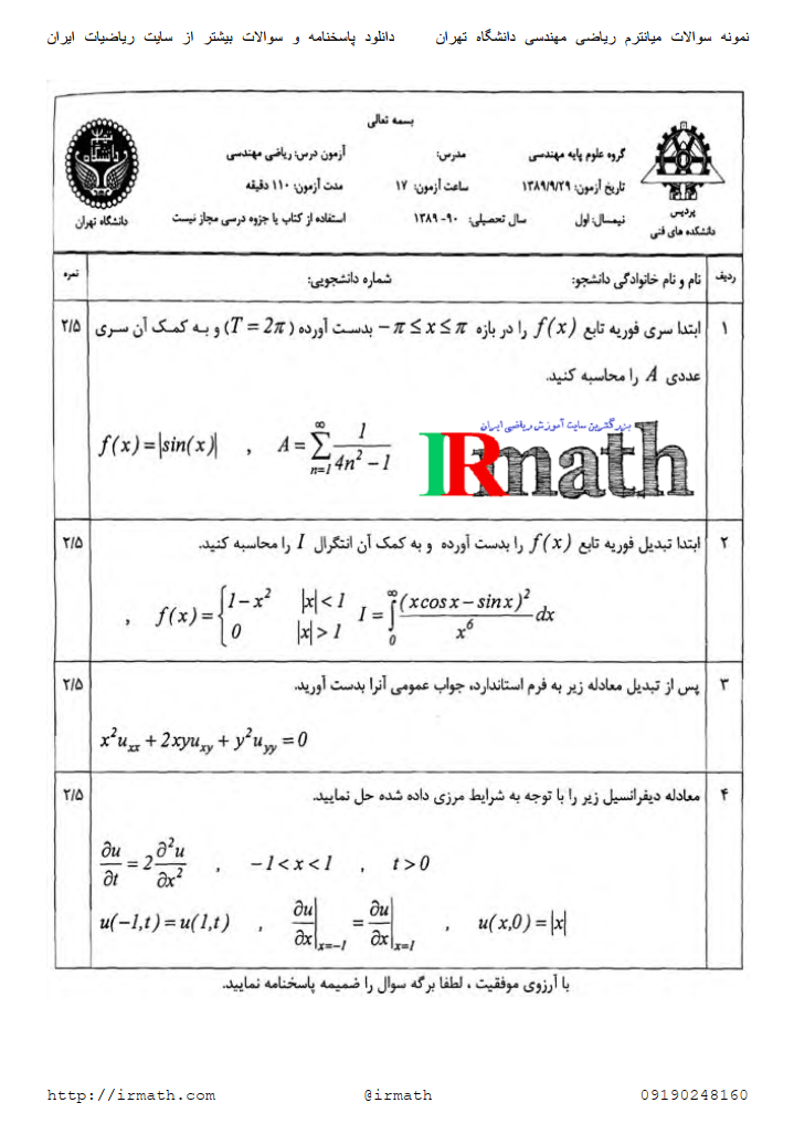 پاسخ تشریحی میانترم ریاضی مهندسی دانشگاه تهران ۱۳۸۹۰۹۲۹