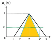 $ \mu_{A_{\alpha}} (x) = \begin{cases} \frac{x-l^{\prime}}{m-l^{\prime}} & l^{\prime} \le x \le m \\ 1 & x = m \\ \frac{u^{\prime}-x}{u^{\prime}-m} & m \le x \le u^{\prime} \end{cases}, $