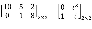 1. $ A=\begin{bmatrix} 5 & 1 & 0\\ 2 & 1 & 3 \end{bmatrix} , B= \begin{bmatrix} 8 & 1 \\ 1& 1\end{bmatrix}$