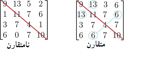 با توجه به تعریف ماتریسهای متقارن میبینیم که ماتریس حاصل شده نسبت به قطر اصلی متقارن میباشند.