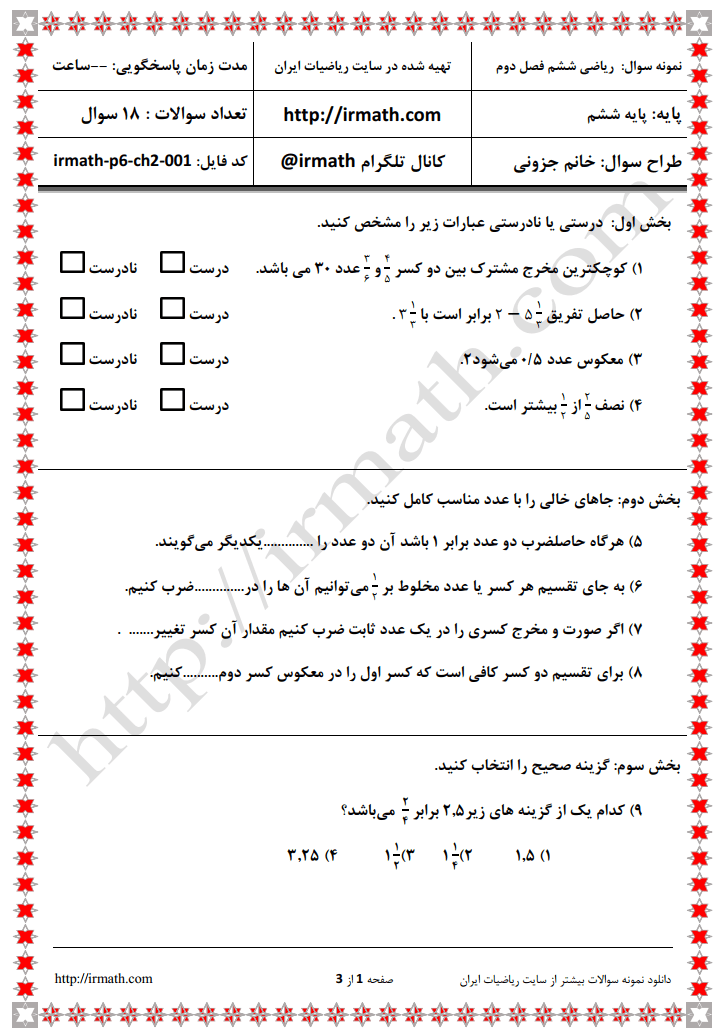 فایل نمونه سوال ریاضی پایه ششم ابتدایی فصل دوم به صورت ورد قابل ویرایش