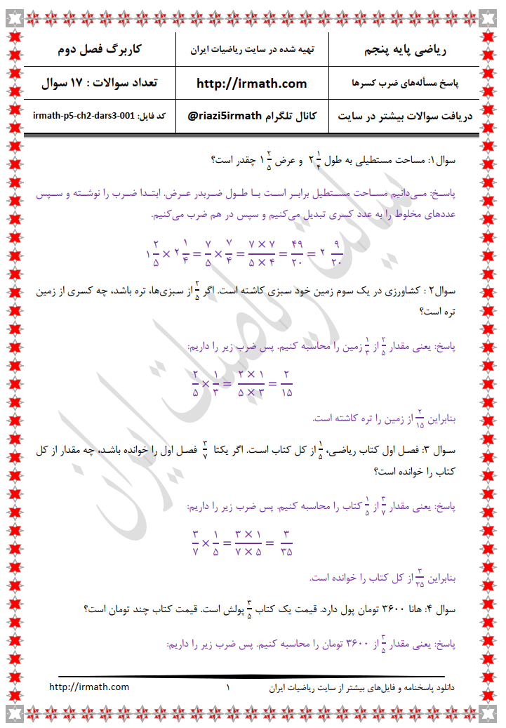 پاسخنامه فایل شماره ۱ تعداد ۱۷ مسأله ریاضی پایه پنجم- فصل دوم- درس سوم- ضرب کسرها