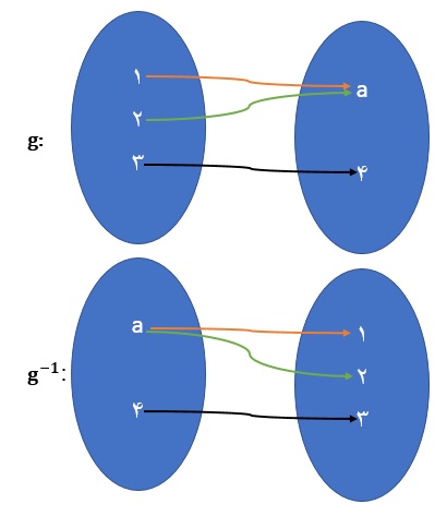 قسمت دوم مثال بالا نشان میدهد که معکوس تابع g تنها یک رابطه است و تابع نمیباشد، زیرا پیکان مربوط به عنصر a در 1-g به دو عضو ۱ و ۲ متصل شده است و این موضوع در تناقض با مفهوم تابع بودن میباشد. اکنون سوالی که در اینجا مطرح میگردد این است که در چه شرایطی معکوس یک تابع، خود نیز یک تابع است؟ برای پاسخ به این سوال میتوانید به مفهوم یک به یک بودن رجوع نمایید.